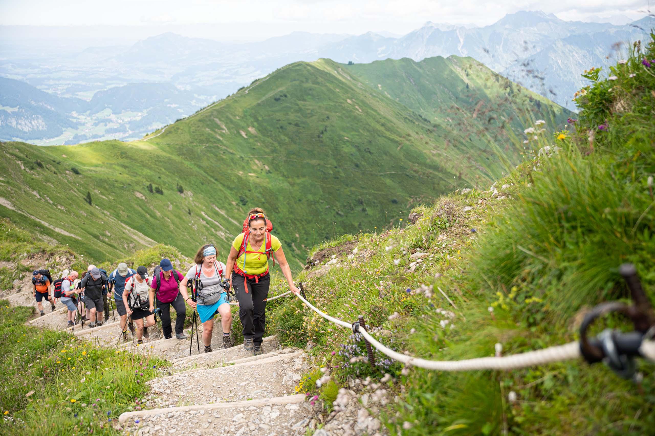 Relaxed hiking in a group with our local hiking guides in the middle of the Allgäu mountains.